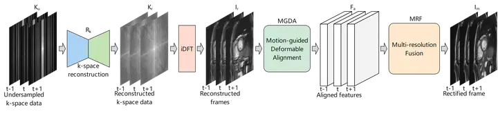 Reconstruction of Cardiac Cine MRI Using Motion-Guided Deformable Alignment and Multi-Resolution Fusion